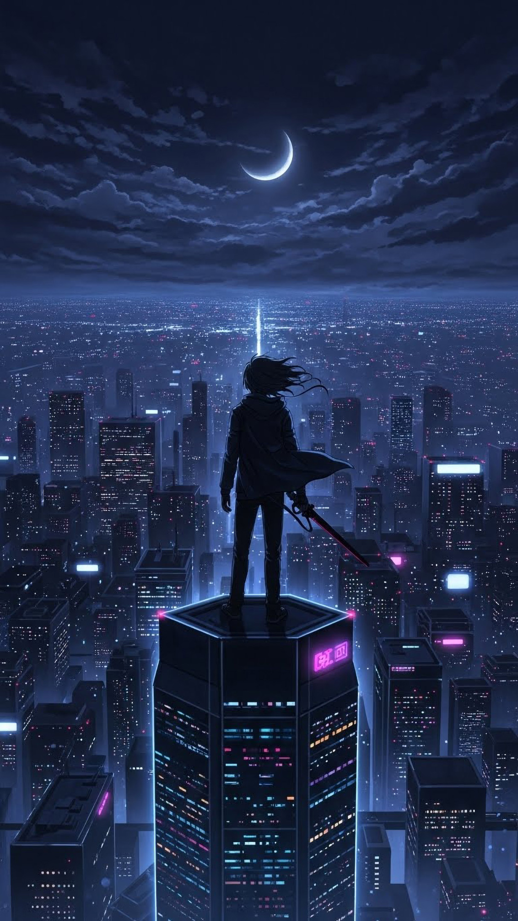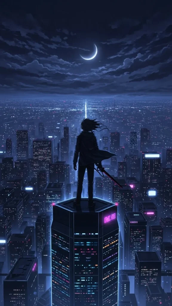 Dark anime city wallpaper featuring a lone warrior standing on a skyscraper rooftop under a crescent moon, surrounded by endless futuristic city lights.