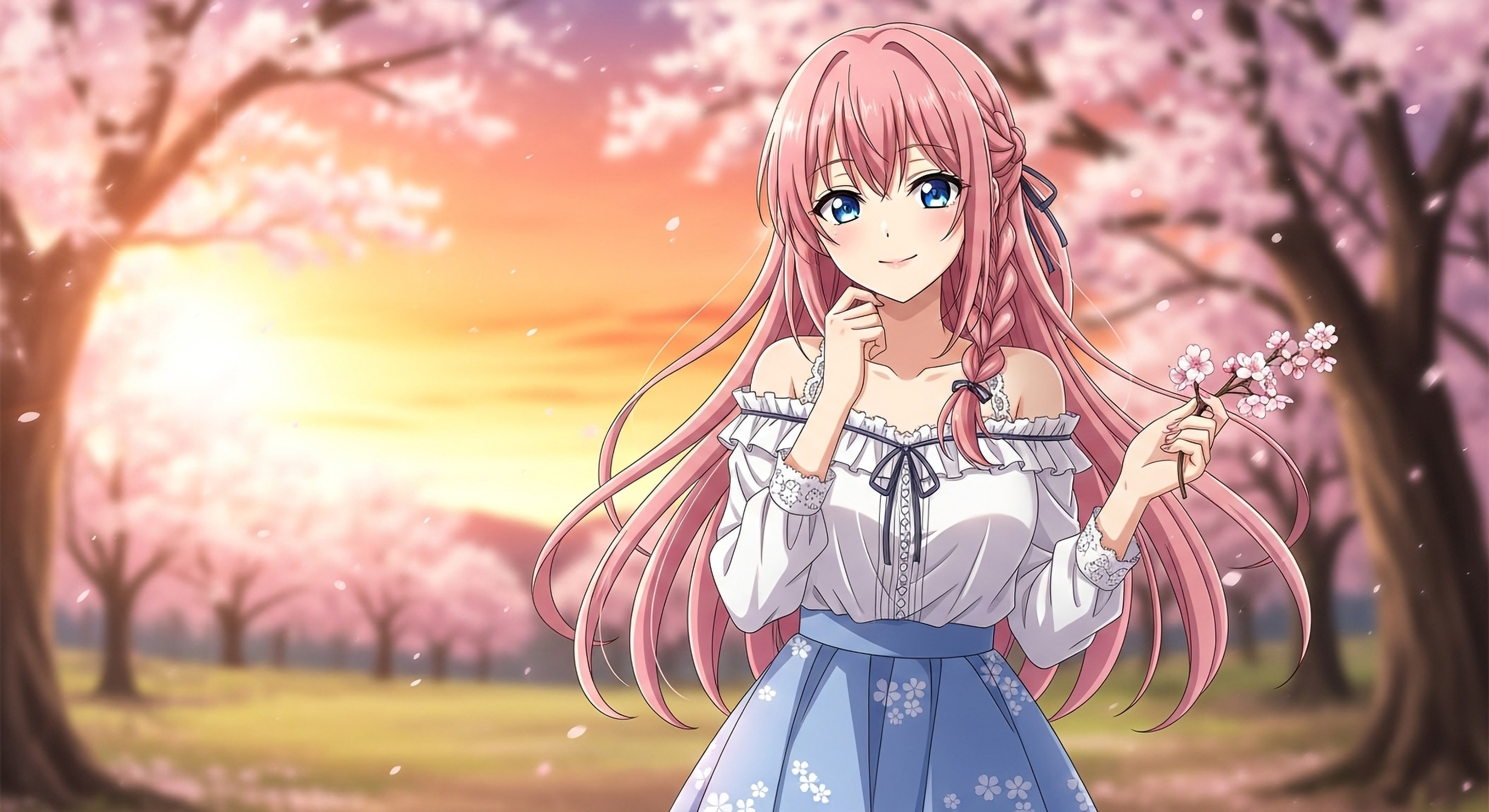 Romantic anime girl wallpaper with cherry blossoms at sunset and warm golden lighting. High resolution anime art perfect for aesthetic and 4K desktop wallpapers.
